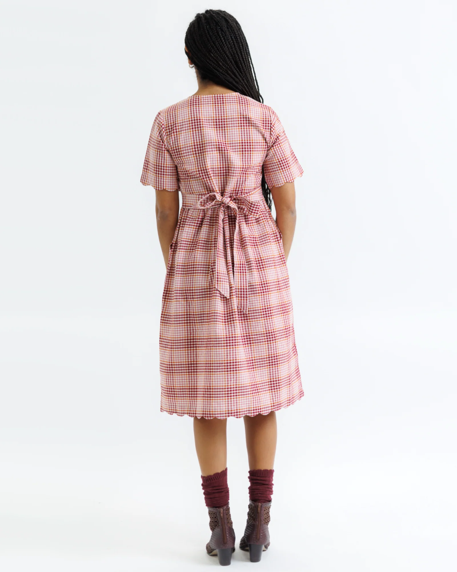 - Scalloped edge down front bodice and at skirt hem